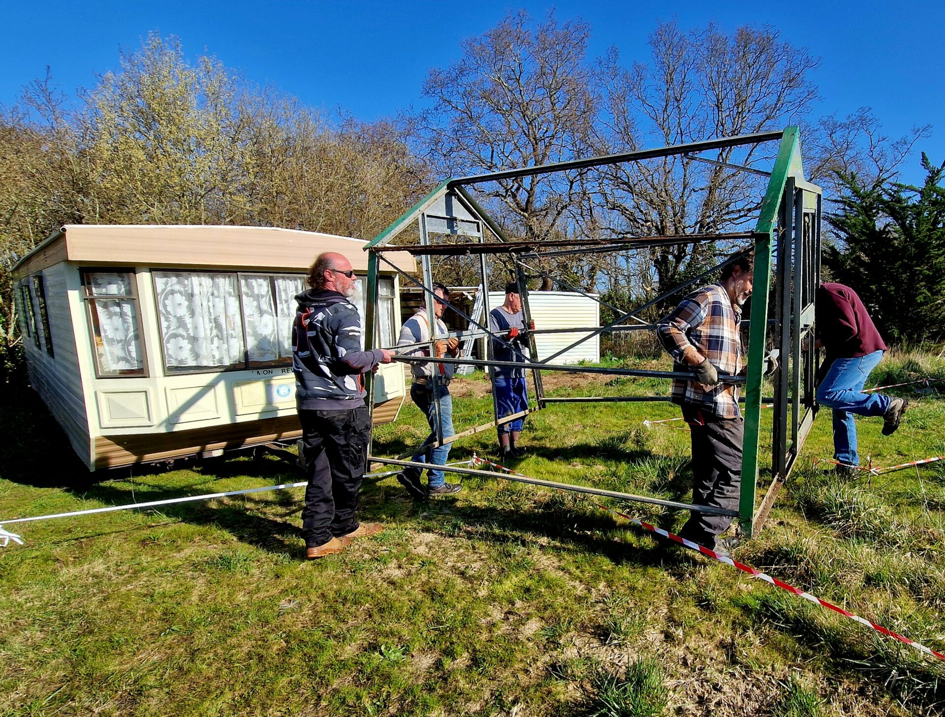 Le déplacement du mobil-home a permis de libérer les futurs emplacements des modulaires. L’équipe a également installé une serre en acier (merci à la donatrice) qui accueillera les futurs oiseaux en convalescence.